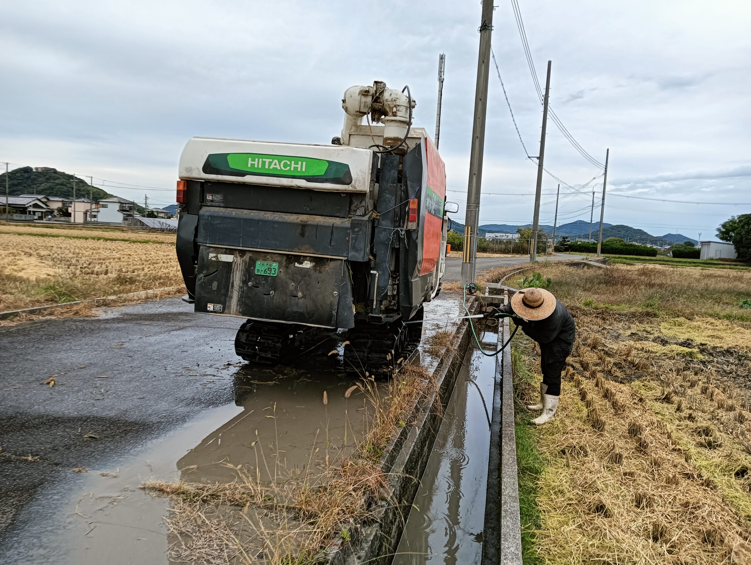 幸いにも用水路に水が流れていたので、ポンプで吸水して足回りを中心に、土やわらクズを丁寧に流し洗いして無事終了です✌️