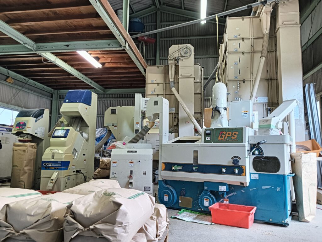 乾燥機(長期保存できるように水分量を15%程度まで乾かします)〜粗選機(ワラの切りくずなど大きなものを取り除きます)〜籾すり機(ゴムロールで籾を摺り落として玄米にします)〜石抜機(稲刈り中に入ってしまう小石なとを取り除きます)〜選別昇降機(小さなお米やヒエの種などをふるい分けます)〜色彩選別機(カメムシが吸ったお米、ヤケの強いお米、高温障害を受けたお米などを取り除きます)〜計量器(多少自然乾燥して軽くなるかもしれないので30.5kgで袋詰めします)🧐