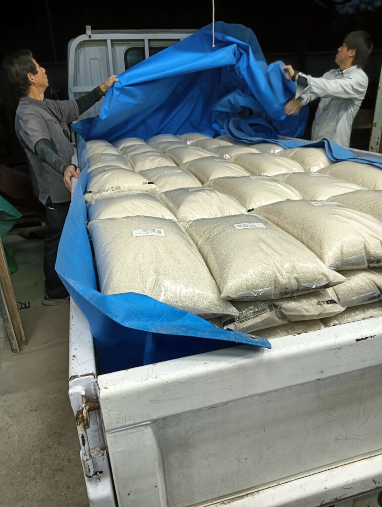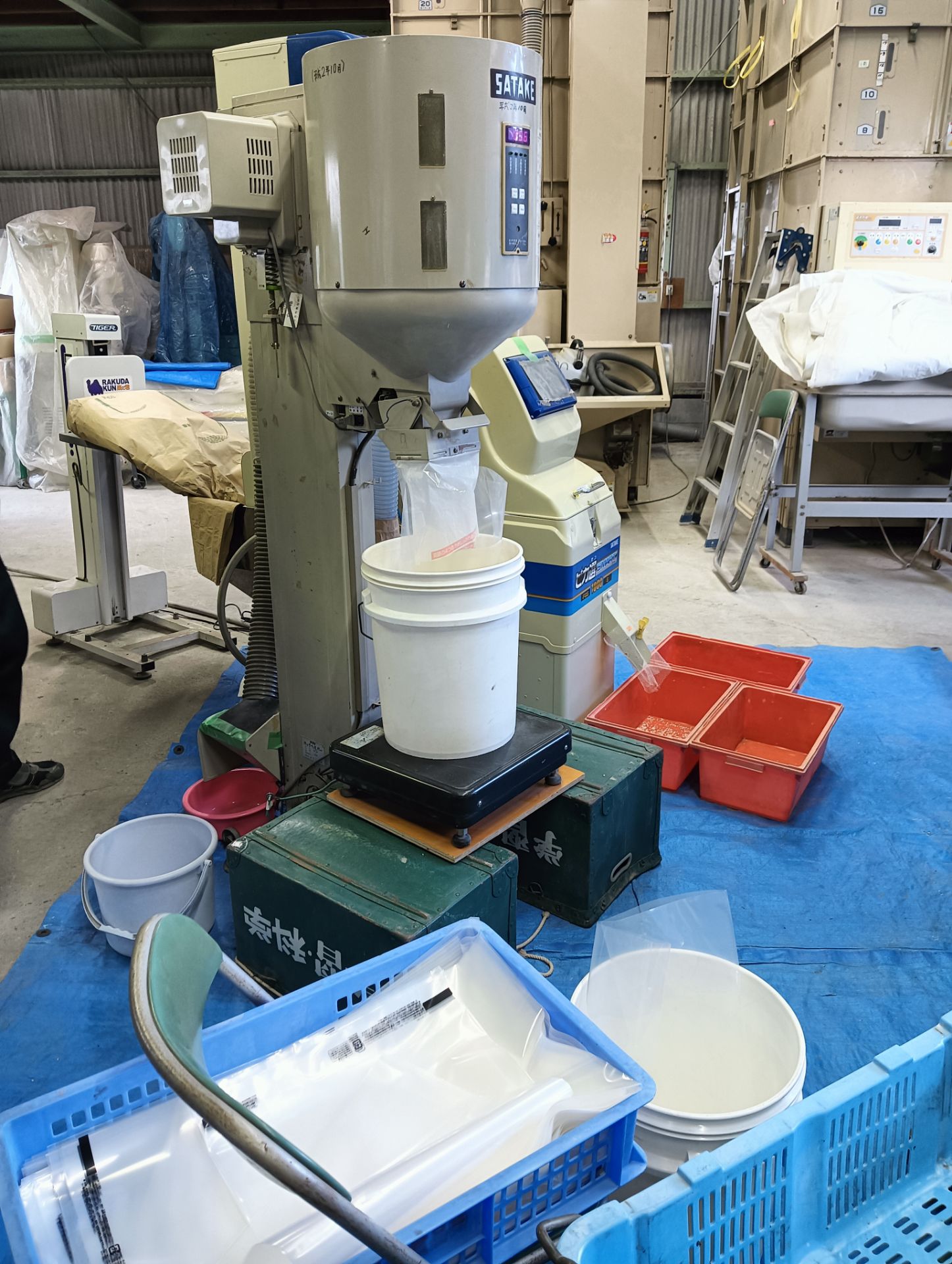 収穫して籾摺りで玄米にする際に光選別機(ピカ選)を通して虫食い、ヤケ米、異物などをはじいていますが、学校給食用は念のためにもう一度精米後にも光選別機を通して10kgごとに袋詰めしています🧐