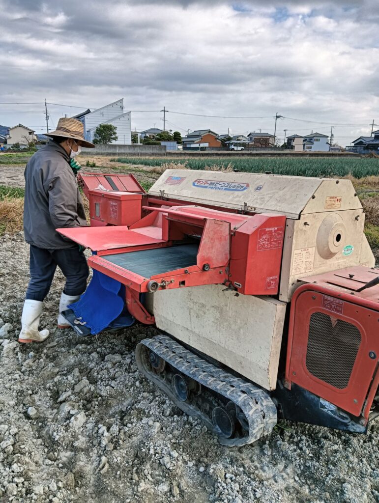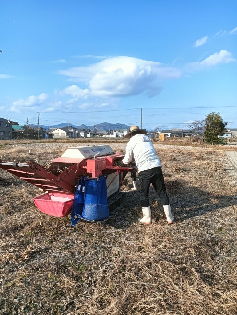 大豆・小豆・黒大豆の脱粒 2025年12月17日 Filed under: お知らせ,大豆 たまふぁーむ 何日か前に手刈りをして何箇所かで積み重ねて乾燥させていた小豆、白大豆、黒大豆の脱粒をしました🫘 もう何年も前に中古で買った自走式のビーンスレッシャー。これがあれば小規模の豆畑なら移動しながら脱粒作業ができ、収穫した豆は袋に入っていきます👍 https://tamada-ltd.com/wp-content/uploads/2026/02/VID_20251216_234419_355.mp4 白大豆はそれなりにまとまった収穫量でしたが✌️、小豆と黒大豆は出荷できるほどの量にはなりませんでした😭